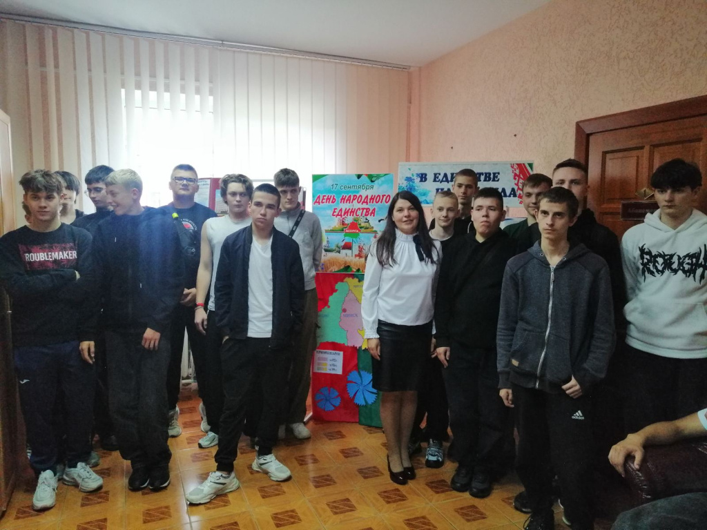 Сотрудник отдела маркетинга, социокультурной деятельности и методической работы рассказала учащимся 321 группы 2 курса аграрного колледжа о празднике, его истории и значении. Она объяснила, почему именно 17 сентября стало Днем народного единства в Беларуси. Особое внимание было уделено достижениям суверенной страны и важности ее государственных символов – герба, гимна и флага. Затем ребята разделились на команды и приняли участие в викторине. Вопросы охватывали ключевые события Великой Отечественной войны: важные даты, подвиги солдат и роль Беларуси в победе над фашизмом.